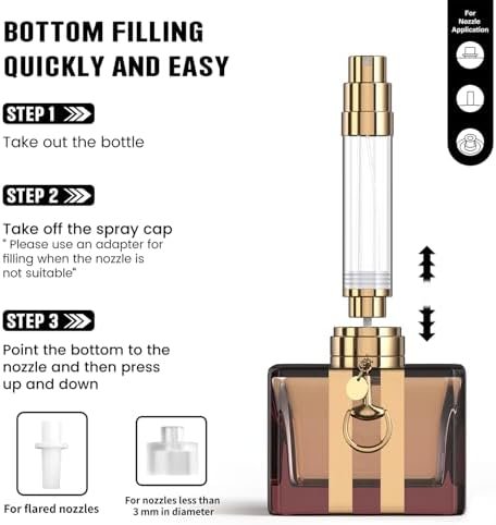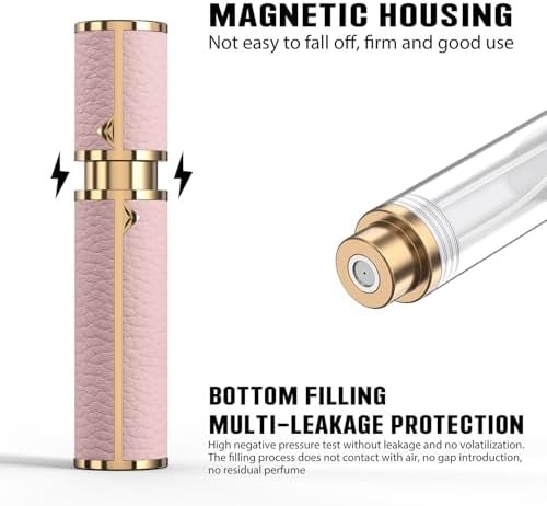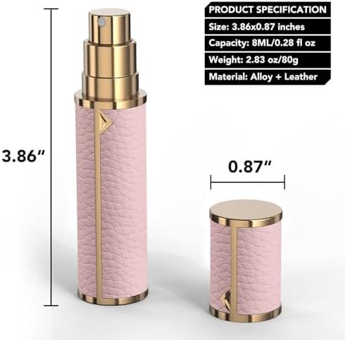 About this item Travel Essentials: This perfume atomizer tucks into purses or pockets like a lipstick, Holds 8ml for approximately 90 sprays, TSA-approved for seamless security checks during flights or train journeys Leakproof Assurance: The travel perfume bottle features a sealed thickened glass core and brass base to prevent leaks and preserve scent, perfect for stashing in your gym bag or glove compartment Quick & Easy to fill: Simply press the bottom valve and use included adapters to fill cologne travel bottle in seconds – no funnels or mess, so you can quickly transfer your favorite fragrances on the go Ultra Fine Mist: High performance travel size perfume refill bottle delivers an even, delicate nano mist that maximizes each drop of fragrance during office breaks or romantic date nights Luxurious Design: Wrapped in genuine leather with a magnetic detachable cap, this mini perfume refillable bottle exudes elegance and makes an unforgettable gift for anniversaries, birthdays or special celebrations